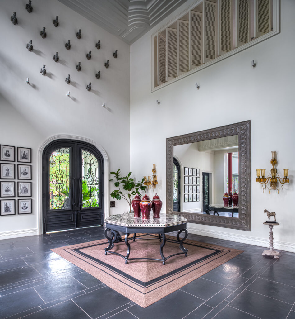 The Grand Entrance & Foyer - A striking monochromatic palette anchors the foyer. The high-volume space features a majestic arched doorway in black, contrasted against crisp white walls. A central octagonal table serves as a pedestal for curated art, reflected infinitely in an oversized, ornate wall mirror.